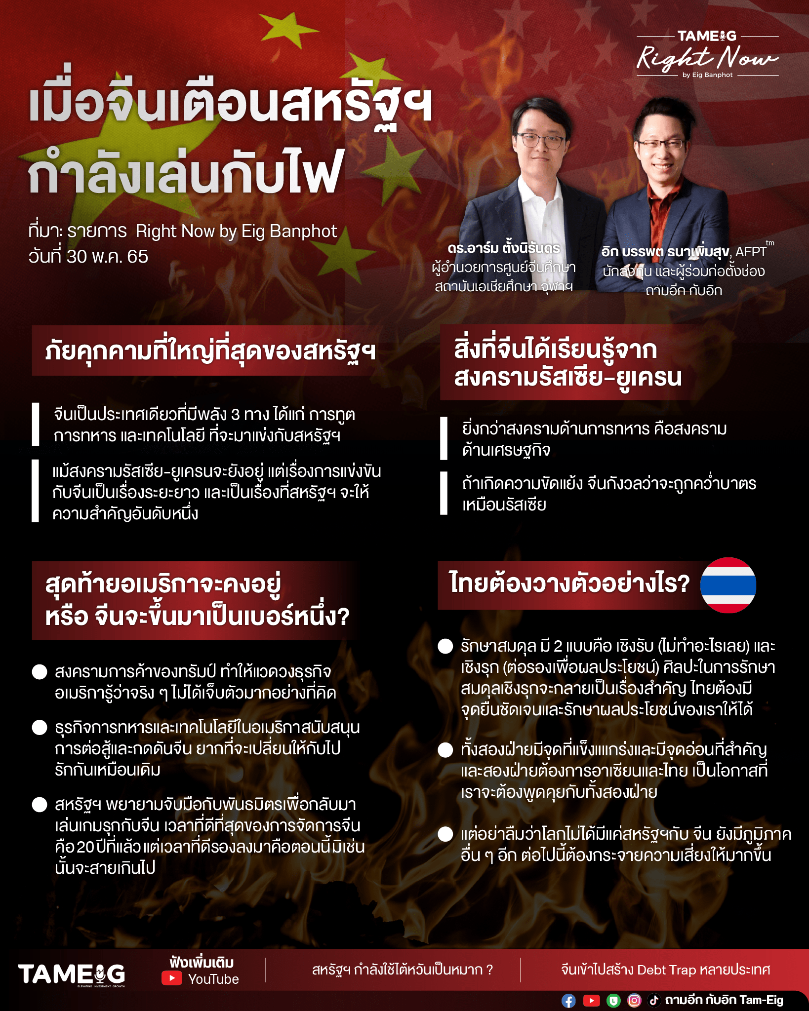 ดร.อาร์ม ตั้งนิรันดร ผู้อำนวยการศูนย์จีนศึกษา สถาบันเอเชียศึกษา จุฬาฯ ได้พูดถึงภัยคุกคามของจีนที่ทางสหรัฐอเมริกามองว่า เป็นภัยคุกคามที่ใหญ่ที่สุดเอาไว้ว่า ความขัดแย้งระหว่างสหรัฐอเมริกากับจีนเป็นความขัดแย้งที่ตึงเครียดมาเป็นเวลานาน ก่อนหน้านี้โลกให้ความสนใจกับความขัดแย้งระหว่างประเทศรัสเซียกับประเทศยูเครนกันมาก