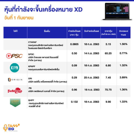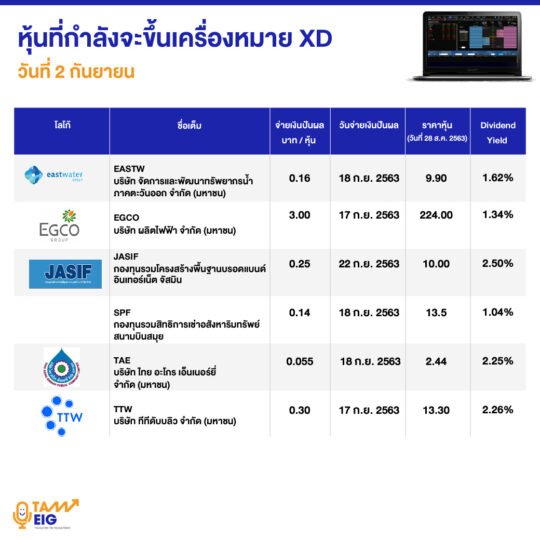 หุ้นที่กำลังจะขึ้นเครื่องหมาย XD ระหว่างวันที่ 1-3 กันยายน 2563