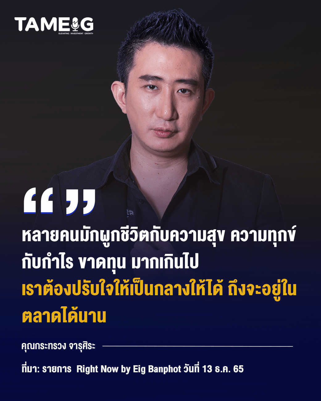 หลายคนมักผูกชีวิตกับความสุข ความทุกข์ กับกำไร ขาดทุน มากเกินไป เราต้องปรับใจให้เป็นกลางให้ได้ ถึงจะอยู่ในตลาดได้นาน