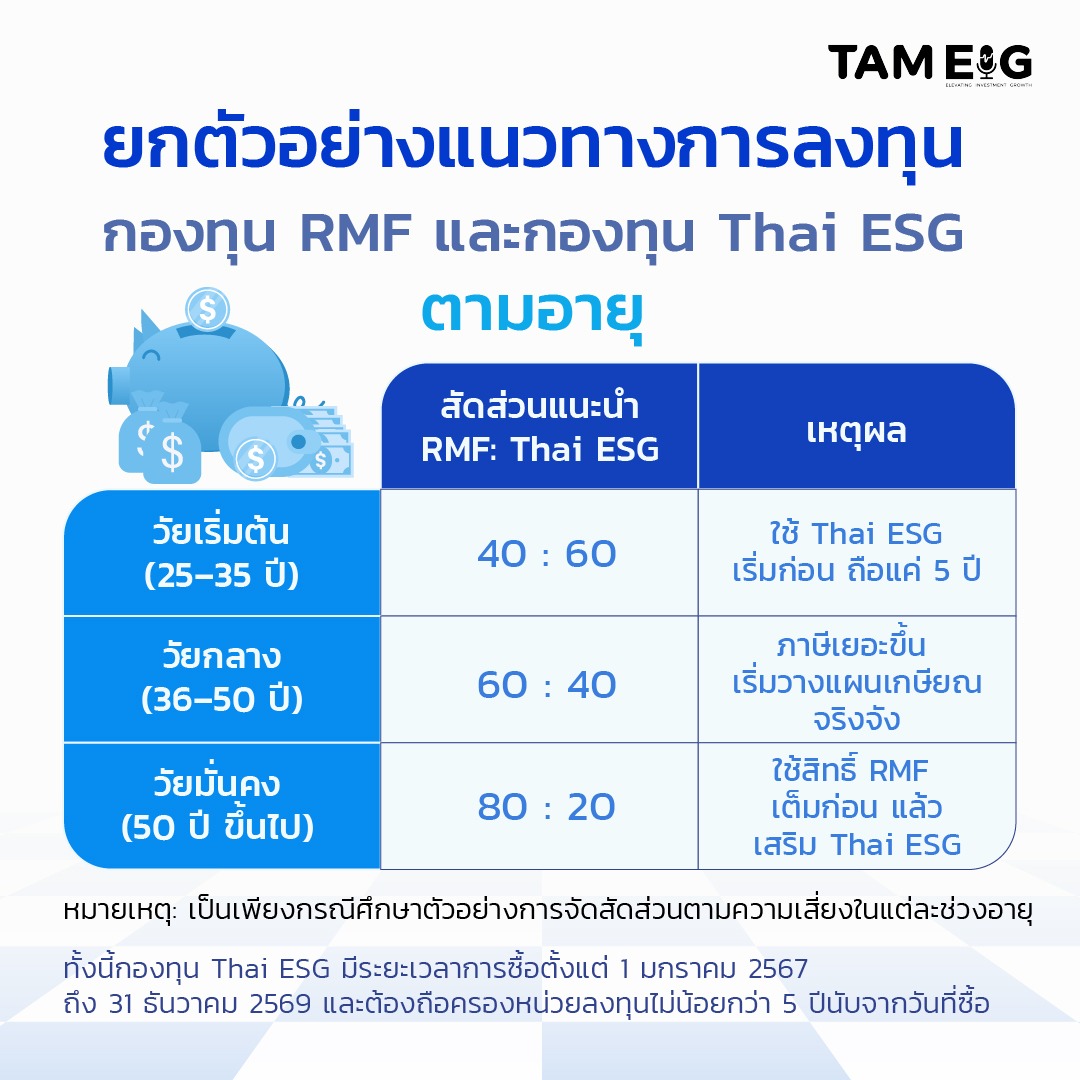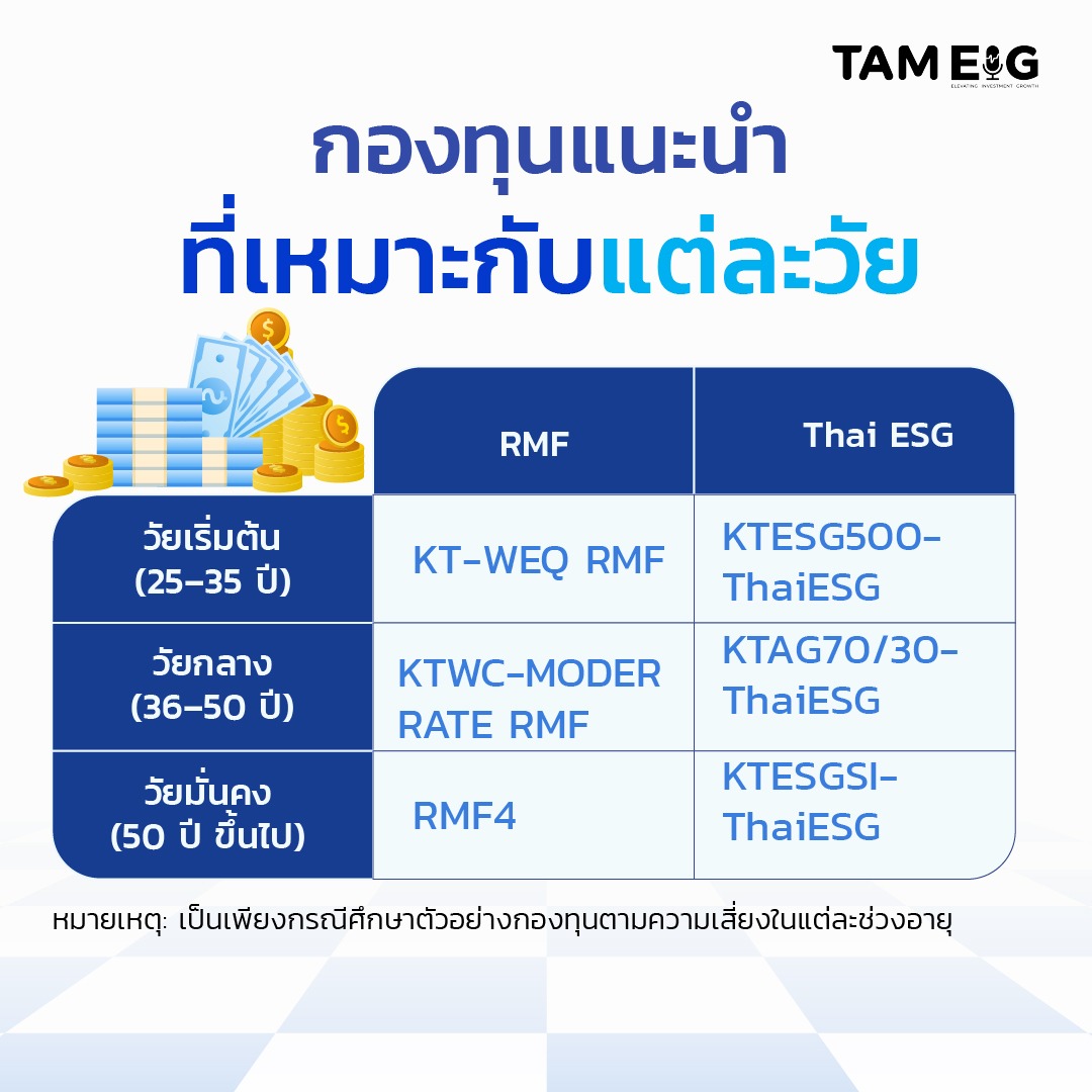 คนวัยนี้เพิ่งเริ่มทำงาน ภาษียังไม่สูงมาก แต่เวลาอยู่ข้างหน้าอีกยาว — จึงเหมาะกับการ “เริ่มจากกองที่ถือสั้น” ให้ Thai ESG มากกว่า RMF เพราะถือแค่ 5 ปี วันชนวันก็ขายได้ ได้ทั้งรับสิทธิประโยชน์ทางภาษีเพิ่มเติม และเป็นจุดเริ่มต้นที่ดีในการฝึกวินัยลงทุน