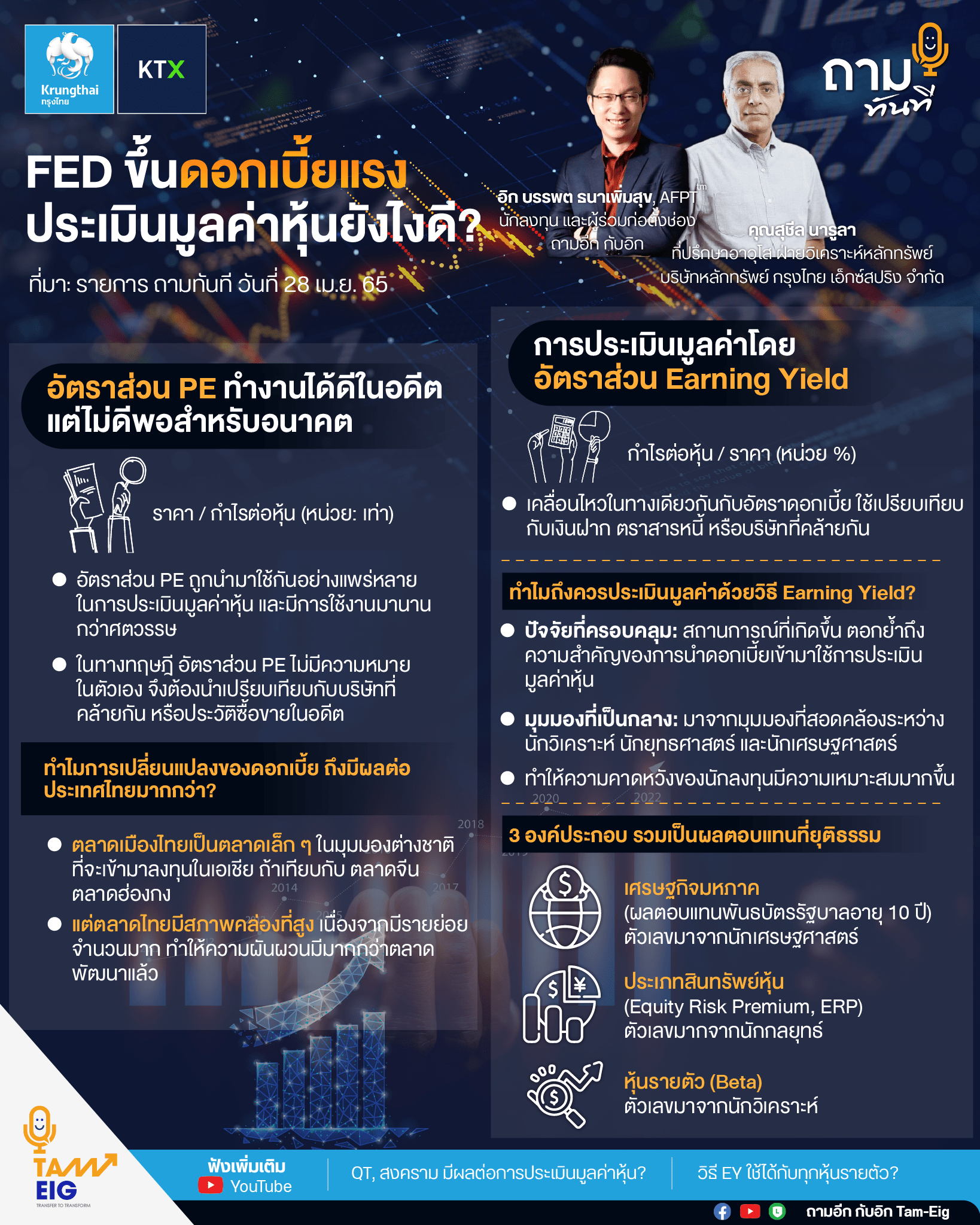 ในการประเมินมูลค่าหุ้นในช่วงที่ดอกเบี้ยขึ้นแรงนั้น เดิมเรามักจะประเมินโดยใช้ผลกำไรต่อหุ้นเป็นหลัก แต่ตรงนี้มันมีผลแค่ 1 ใน 3 ต่อการเปลี่ยนแปลงของดัชนี มองว่าอัตราส่วน PE ทำงานได้ดีในอดีต แต่ไม่ดีพอสำหรับอนาคต  แม้ว่าอัตราส่วน PE ถูกนำมาใช้กันอย่างแพร่หลายในการประเมินมูลค่าหุ้น และมีการใช้งานมานานกว่าศตวรรษ  แต่ในทางทฤษฎี อัตราส่วน PE ไม่ได้มีความหมายในตัวเอง จึงจำเป็นต้องนำไปเปรียบเทียบกับบริษัทที่คล้ายกันหรือประวัติซื้อขายของตัวเองในอดีต