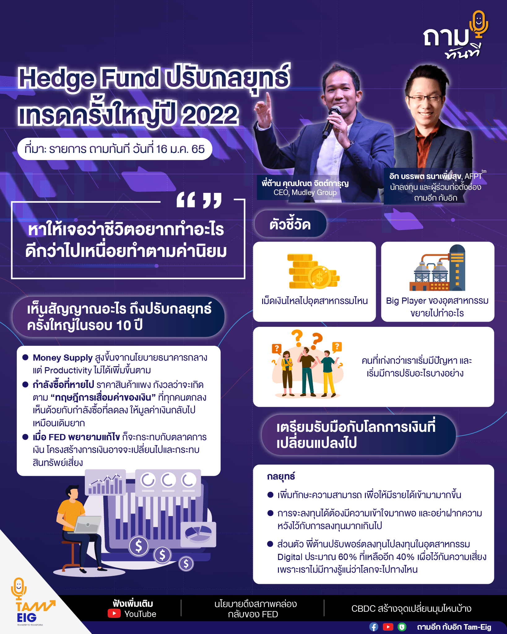 สิ่งที่ต้องเตรียมพร้อมคือ การพัฒนาทักษะความสามารถของเราให้ดียิ่งขึ้น เพื่อให้มีโอกาสสร้างรายได้เข้ามามากขึ้น อีกทั้งการจะลงทุนจะต้องมีความเข้าใจมากพอ ต้องศึกษาให้ดี แต่อย่าฝากความหวังไว้กับการลงทุนมากเกินไป ส่วนตัวพี่ต้านเองก็มีการปรับพอร์ตลงทุนไปลงทุนในอุตสาหกรรมที่เกี่ยวข้องกับ Digital ประมาณ 60% ส่วนที่เหลืออีก 40% เผื่อไว้กันความเสี่ยง เพราะเราไม่มีทางรู้แน่นอนว่าโลกจะไปทางไหนในอนาคต
