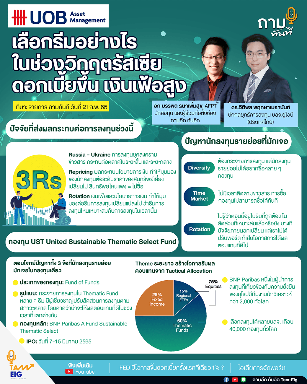ดร.จิติพล พฤกษาเมธานันท์ นักกลยุทธ์การลงทุน บลจ.ยูโอบี (ประเทศไทย) ได้พูดถึงสถานการณ์ที่ต้องจับตามองในเวลานี้ก็คือ เรื่องของการปรับอัตราดอกเบี้ยของธนาคารกลางสหรัฐ (FED) ที่อาจมีการปรับอัตราดอกเบี้ยมากถึง 9 ครั้งในปีนี้ และวิกฤตการณ์ที่เกิดขึ้นในประเทศรัสเซีย-ยูเครน