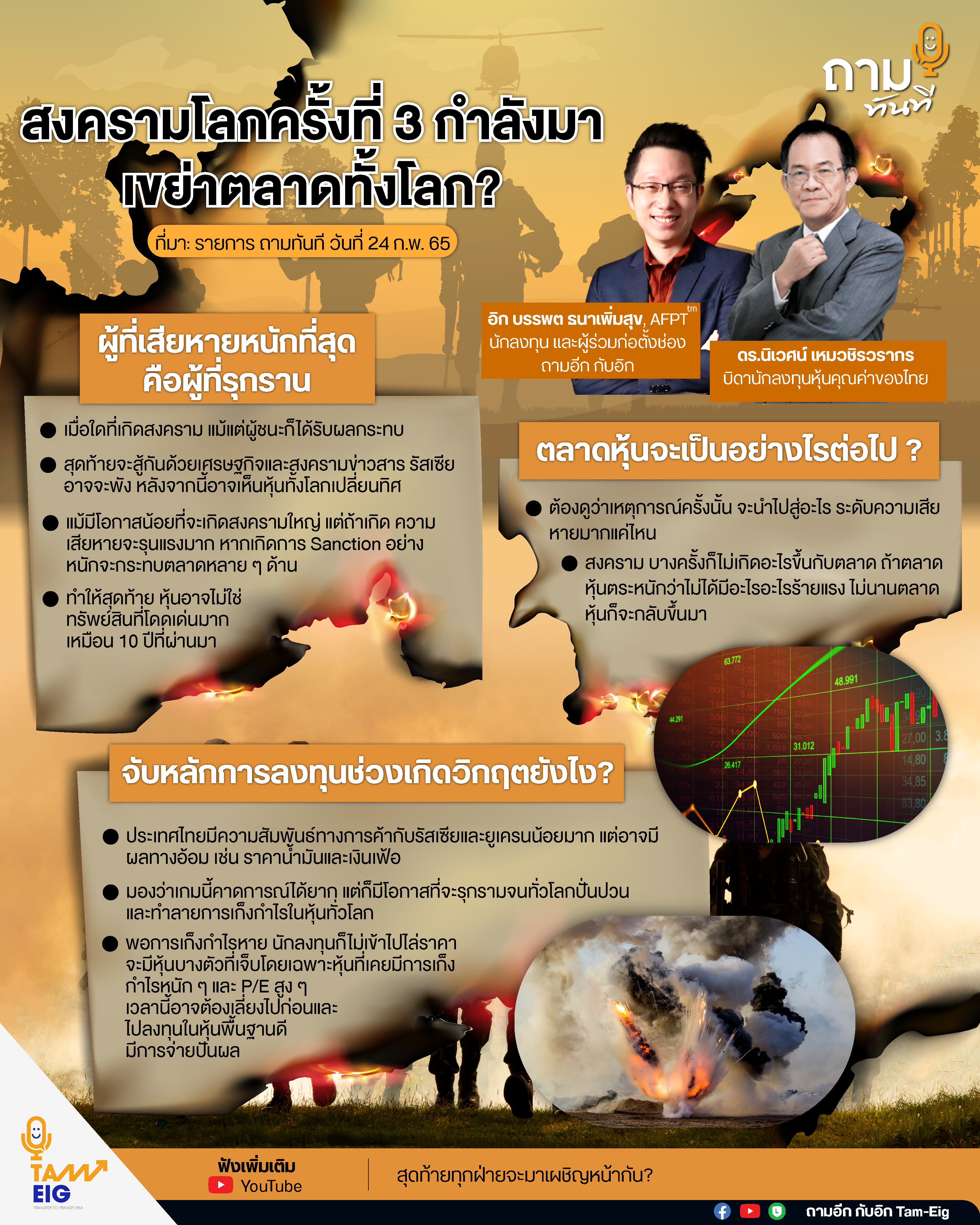 คาดว่าประเทศไทยไม่ได้รับผลกระทบมากนัก แต่จะได้ผลกระทบทางอ้อม อย่างเช่นราคาน้ำมันที่ปรับตัวเพิ่มสูงขึ้น ส่วนกลยุทธ์การลงทุนนั้น อยากให้คิดว่าหุ้นตัวไหนที่ถือแล้วจะเจ็บที่สุด แต่ถ้าหากถือหุ้นที่มีพื้นฐานดี ไม่ใช่หุ้นเก็งกำไร ราคาหุ้นก็จะอิงกับพื้นฐานและมีแนวโน้มเป็นหุ้นที่มีกำไรและจ่ายปันผลให้เราทุก ๆ ปี ซึ่งหากซื้อหุ้นแล้วอยากให้ลองกลับไปคิดว่า หุ้นตัวนี้ให้อะไรให้กับเรา