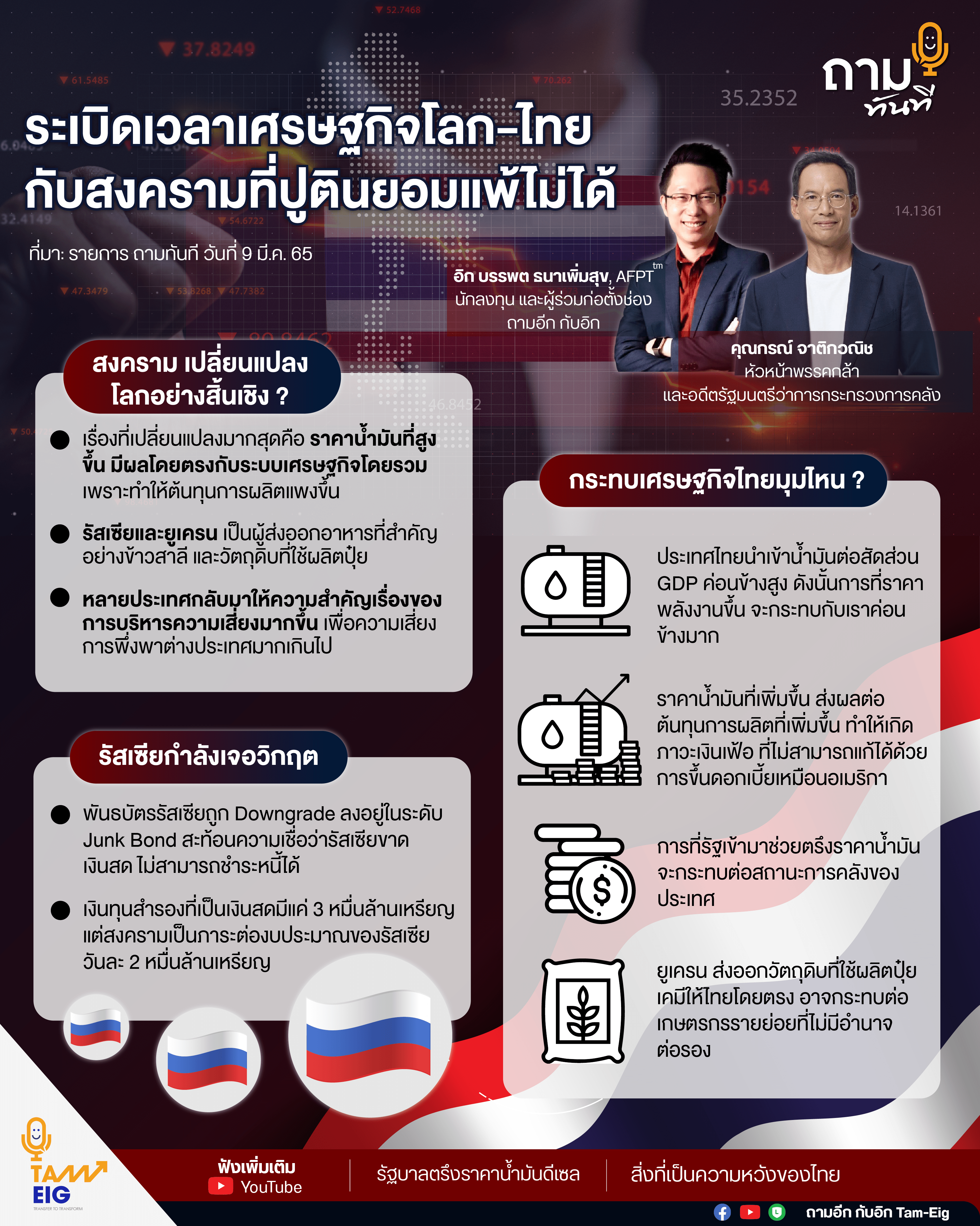 คุณกรณ์ จาติกวณิช หัวหน้าพรรคกล้า และอดีตรัฐมนตรีว่าการกระทรวงการคลัง ได้พูดถึงสถานการณ์สงครามรัสเซีย-ยูเครนเอาไว้ว่า สงครามครั้งนี้จะอยู่กับเราไปอีกระยะหนึ่งอย่างแน่นอน แม้ว่าสงครามจะจบด้วยการถอนกองกำลัง แต่สุดท้ายก็ไม่ใช่ว่าทุกอย่างจะกลับไปเหมือนเดิมเหมือนไม่มีอะไรเกิดขึ้น แต่ก็เป็นวิธีที่ดีที่สุด แต่ก็มีโอกาสเกิดขึ้นน้อยที่สุดเช่นเดียวกัน หากสถานการณ์ยังคงยืดเยื้อต่อไป มองว่าจะส่งผลกระทบต่อเศรษฐกิจอย่างน่ากังวล